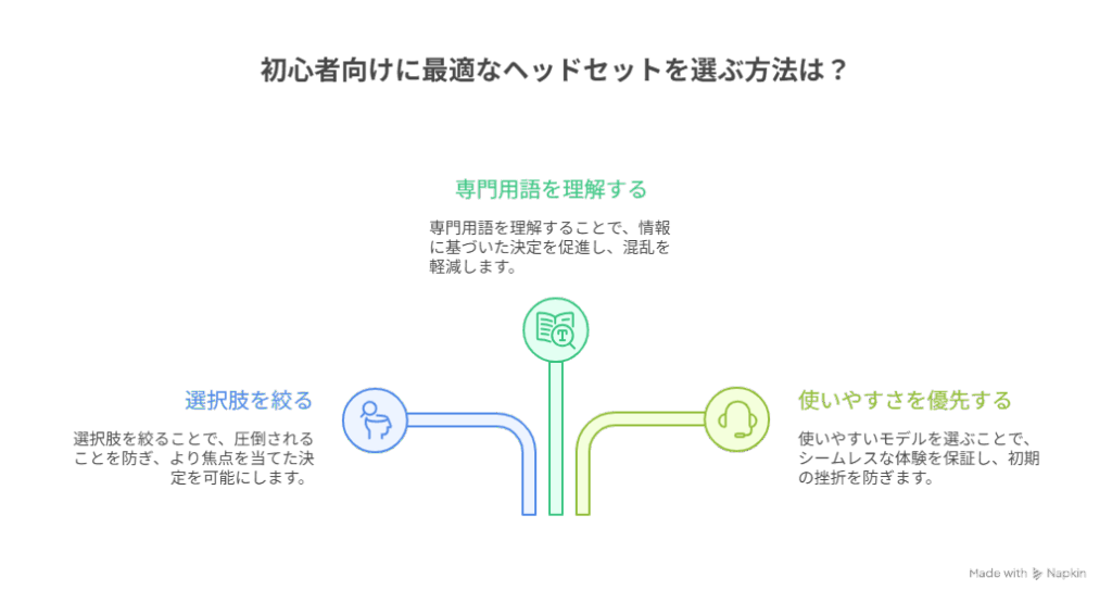 ヘッドセット選びが初めての方にとって、多すぎる選択肢と専門用語の数々は混乱の原因となりがちです。ここでは、初心者の方でも失敗しない選び方のポイントと、扱いやすさを重視したおすすめモデルをご紹介します。