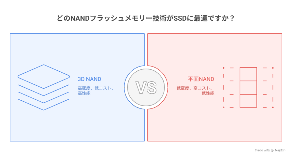従来の平面的なNANDと異なり、メモリーセルを縦方向に積み重ねた技術です。これにより、同じ面積でより大容量を実現し、製造コストの削減と性能向上を同時に達成しています。
