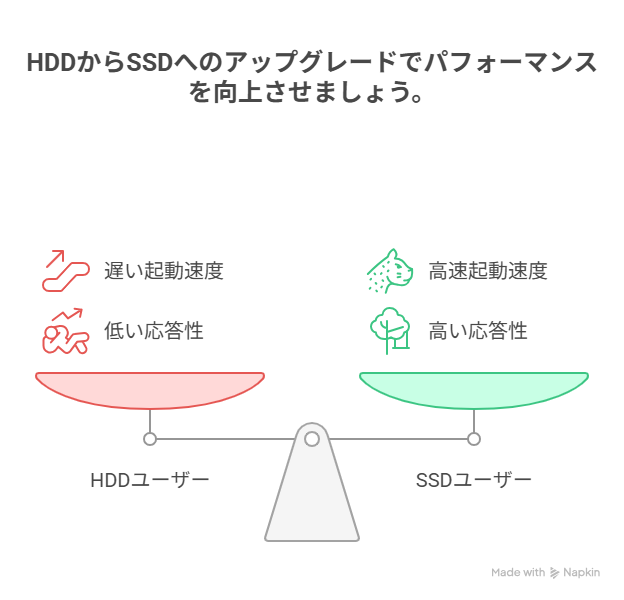 HDDからSSDに交換すると、Windows起動時間が約30秒から10秒以下に短縮されます。これは、SSDのランダムアクセス性能がHDDの約100倍優れているためです。