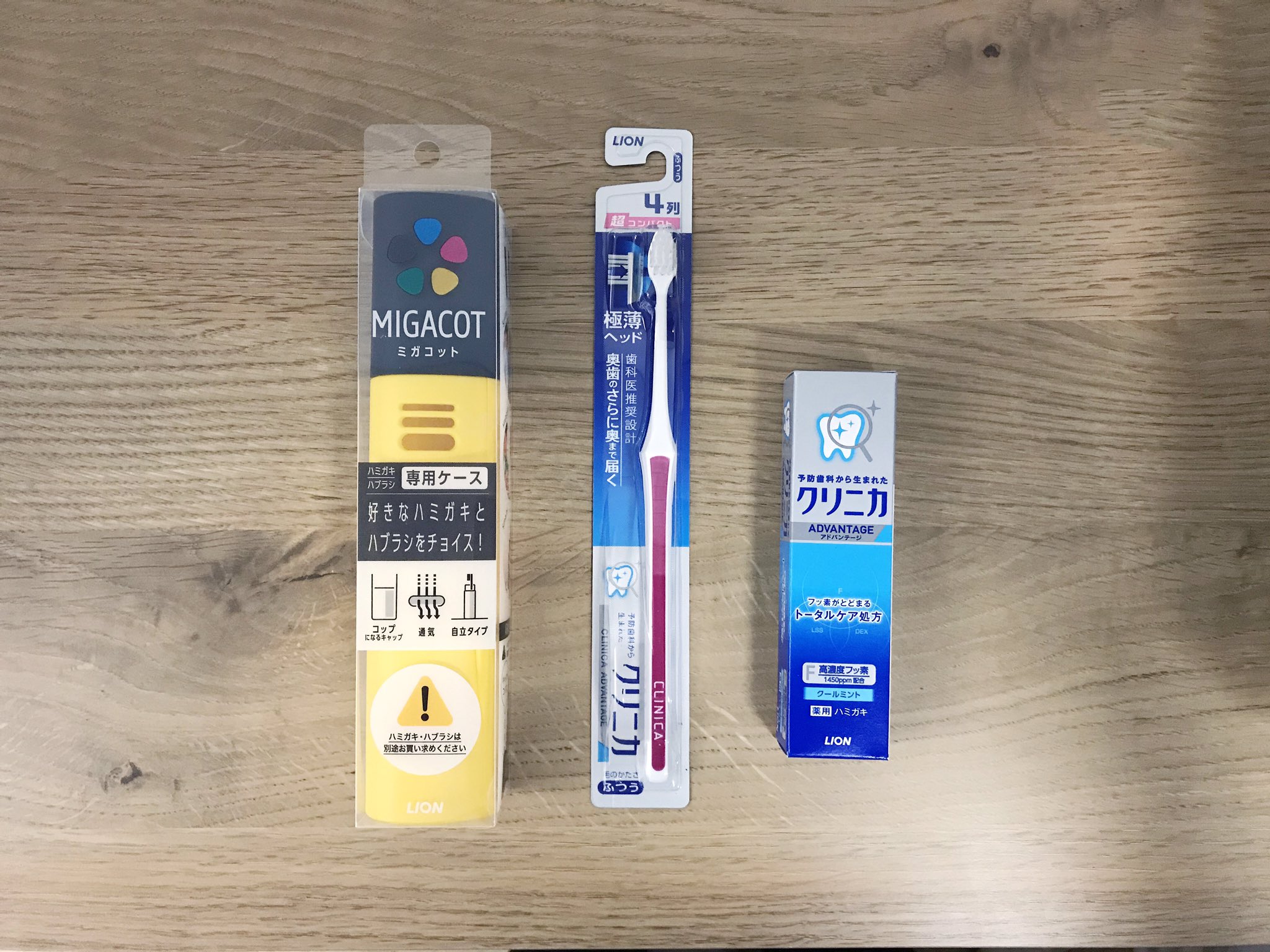 ミガコットはライオンから発売されている携帯用オーラルケアセットです。歯ブラシ・ミニサイズの歯磨き粉・コップがひとつになった便利なアイテムで、オフィスや外出先でもすぐに使えるのが特徴です。
